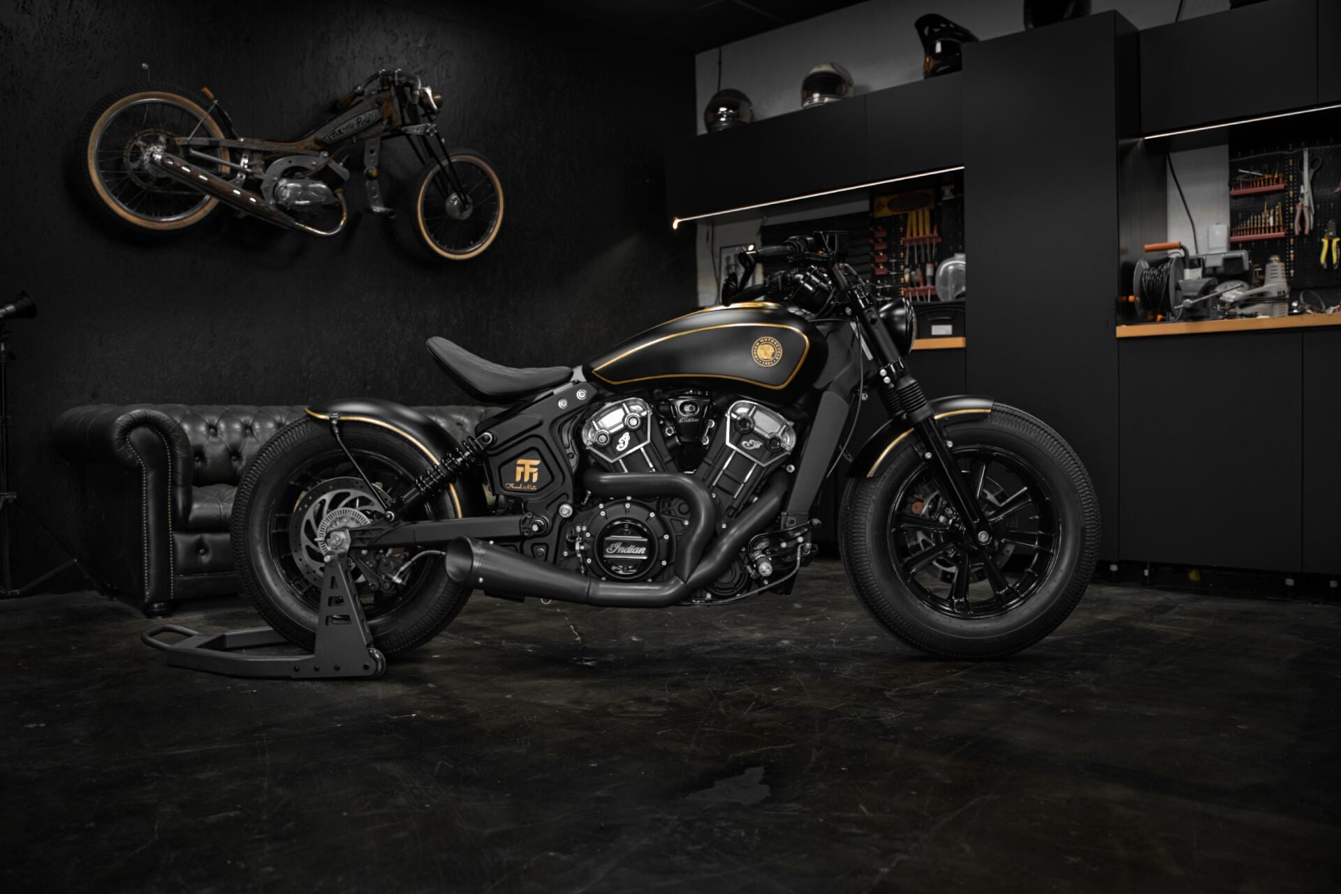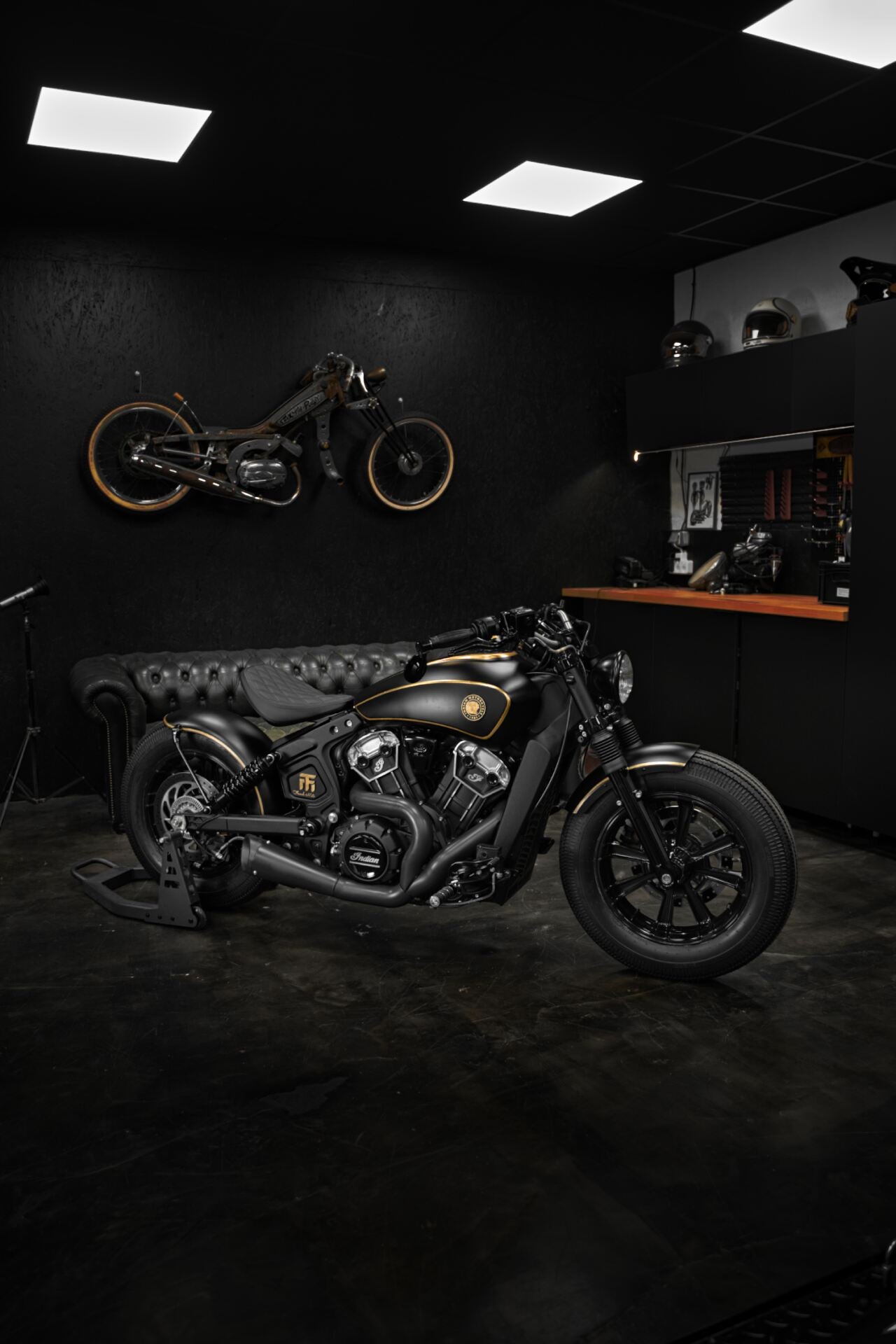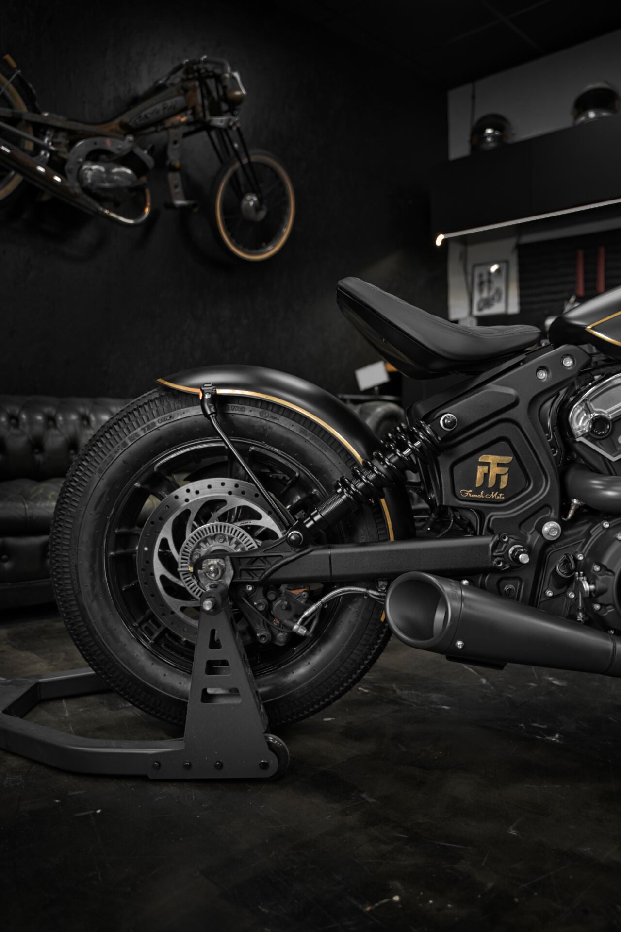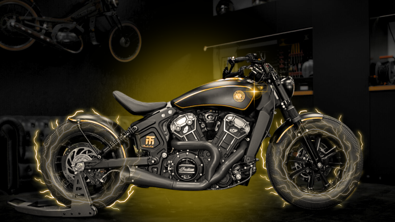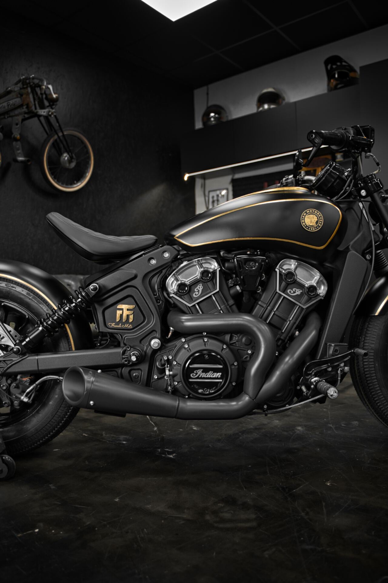 L’Indian Scout Bobber préparée par l’atelier French Moto, baptisée Golden Era, transcende l’idée même du custom. Entièrement façonnée à la main au fil de centaines d’heures de travail, elle se pare de subtiles applications de feuille d’or véritable, révélant un sens du détail réservé aux pièces d’exception.